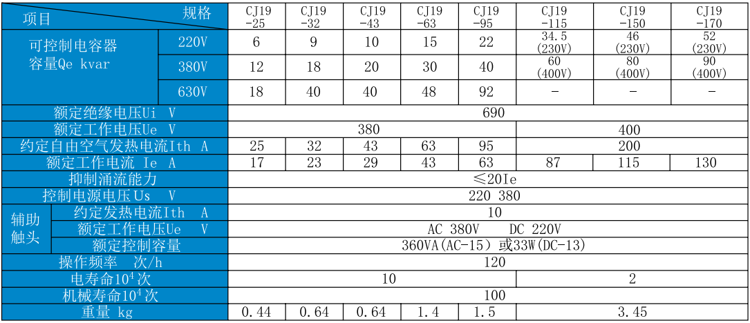 CJ19系列切換電容器接觸器(以下簡稱接觸器)主要用于50Hz(或60Hz)、額定工作電壓至400V的電力系統中,作為功率因數補償裝置中可控電容器至90Kvar的自愈式低壓并聯電容器的投入和切除之用。接觸器帶有抑制涌流裝置,能有效的減小合閘涌流對電容器的沖擊和抑制開斷時的過電壓。